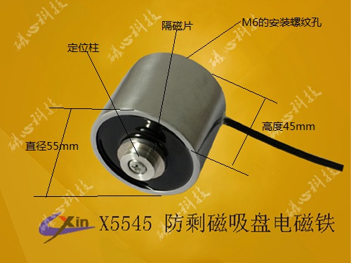 X5545防剩磁吸盤電磁鐵屬于微型直流吸盤式電磁鐵電磁鐵廠家研發、生產的防剩磁吸盤電磁鐵X5545具有大吸力的同時可以有效的把剩磁降低至5克之內,產品的直徑為55mm,高